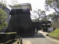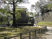 熊本城の東側の入口です。坪井川にかかる厩橋(うまやばし)を渡ったら左折します。門まで広場になっていますので、いづれはここで「ちょんかけごま」の練習をする予定です。厩橋の右手は高橋公園、左手には稲荷神社もあります。