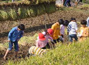 24日の行事でしたが、晴天でほっとしました。老人クラブからも8名の協力があり、楽しい作業も能率よく進み、午前中には終了しました。カマを使用しますので、けがをしないかと心配します。しかし、上級生の面倒見がよいので事故もなくできました。かけ干しのもち米は4俵以上は収穫があり、1俵はどんどやのオモチになります。担当のPTA役員の方には、田植えからお世話になっています。 |