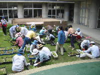 作業の内容は、育苗箱の小さな苗を黒いビニポット(直径9cm)に移植するというものです。花苗は、センニチコウとメランポジュームの二種類です。苗が育った育苗箱は30ケースほどあり、大変根気のいる作業です。1ケースに28個ずつのポットを入れ、それを次から次と並べていきます。いつ終るかわからないほどの苗の量でしたが、皆様方は黙々と移植をしてくれました。