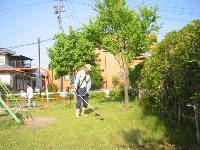 この作業で困ったのは、小学生や幼い子がいたことです。すぐ近くにブランコがあり、遊んでいました。作業場所を変えたり、子どもに話してしばらく遠くに行くようたのみました。草刈り機の刃はロープですから、小石を跳ね上げます。ボランティアとはいえ、子どもにけがをさせたら大変です。朝早くすれば子どもはいませんが、近くの民家ではまだ寝ている人もいます。気を使った1時間でした。次回ここで草刈りするのは、夏休みになってからと予定しています。