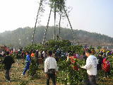 写真1は、電柱の穴を掘る重機です。クレーン付きの大型ドリルが備えられ、直径50cmほどの穴を開けることができます。穴は五ヶ所で、一ヶ所に3本ずつの孟宗竹を入れていきます。このときは午前8時です。15本の大きな竹は前日近くの山で切ったものですが、人の力では動かず、トラクターとトラックで引きずりおろしました。
