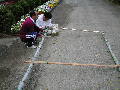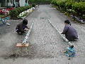今度はM先生とK先生がやってきました。ネットがゆるまないように、横に木材を通して針金でしばります。ここまでしておけば、ツルレイシがたくさん実をつけても大丈夫です。たぶん台風がきても倒れないでしょう。一方私は、竹を設置する穴掘りです。今まで計画はあったのですが、ここの花壇にこだわる人がいて、困っていました。