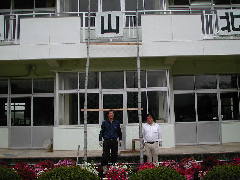 ご覧の通り、二階の廊下まで届く「特大ヘチマ棚」が完成しました。平成14年4月の中旬、気持ちよく記念写真です。ヘチマ棚は別の場所にあったのですが、離れていたため授業のときは移動しなければなりませんでした。この後は、理科専科のM先生にまかせることにします。二階から見ていた子どもが言いました。「校長先生、これは非常階段ですか。」