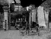写真5 当時の正門です。現在と同じ場所にありました。自転車を押している生徒二人、幼児をおぶった女性の姿が見えます。現在の校舎は校地の北側にありますが、写真では南側にあります。