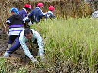 私にとって、稲刈は初めての体験です。子どもたちと一緒に、のこがまを使って稲の株を刈りました。雨上がりのため田んぼがぬかるみ、思うように歩けません。この時代に手作業の稲刈をする農家はありませんが、何事も体験させることは必要です。この作業を通してお米を大切にしたり、家族の苦労がわかればいいのです。(H12.10.24)