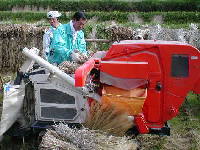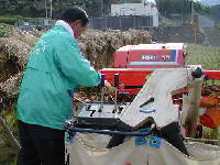 天日で乾燥させて1ヶ月、いよいよ脱穀の日になりました。副会長の小山さんに機械の操作方法を教えてもらい、実際にやってみました。10分もすれば、稲の束の入れ方やタイミングの要領を覚えました。朝9時から11時までの2時間で、天日干しの一列が終了しました。機械の操作で注意することは、稲束を送るチェーンに自分の手をはさまないようにすることです。(H12.11.13)