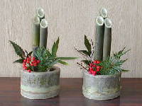 ふれあい活動で竹の余りをもらい、何を作ろうかと考えていました。平成5年の古い新聞記事を取り出し、調べてみました。門松つくりの名人の記事を見て、私も挑戦することにしました。まずは小さな卓上型門松の作成です。1時間ほどで完成しました。高さは20cmです。校長室の入り口に飾っています。(H12.12.1)