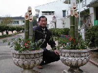 2時間後に何とか完成しました。ポイントは、竹の節も含めて切断したことです。のこぎりだけで切りますので、なかなか鋭角にするのは苦労します。孟宗竹を土で固めて、飾りにパンジーとノースポールを植えました。時期が早すぎるかなと心配しましたが、授業参観のときに見てもらえるでしょう。平成12年12月1日完成。