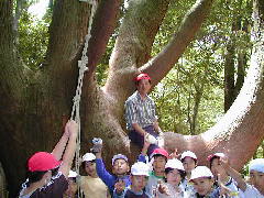 下山の途中に「天狗杉」を見学しました。樹齢300年以上と思われるこの杉の大木は、実に面白い形をしています。子どもたちを押しのけ、一番最初に木に登ったのは私なのです。早速記念写真をとってもらいました。下山コースは登りのコースとは異なります。少年自然の家に帰る途中、菊池川支流の川でいよいよ「川遊び」となります。