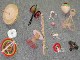 11月21日、20分間の全校集会で「こま回し」をしました。右の写真はそのとき使ったこまの数々です。肥後ごま・かねごま・鉄胴ごま・中国のこま・ちょんかけごま・つなわたりごま、そしてキーホルダーのこまといろいろ体育館に運びました。まず簡単に回せるこまから実際にやってみせました。キーホルダーの小さなこまが床の上で回転したとき、こどもたちはとても不思議に感じたようです。(H12.11)