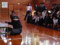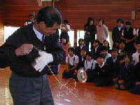 さいごに実演したのが、「つな渡りごま」です。このこまは高価なので、自作したものです。直径20cmの大きなこまが、テグス(3号)の上をゆっくり移動するのを、子どもたちは息を止めて見つめました。全校集会で「こま回し」をしたのは成功だったと思います。廊下で出会うとよく話しかけてくれるようになりましたし、あいさつも以前よりしますので、子どもたちとの距離がまた近まったようです。
