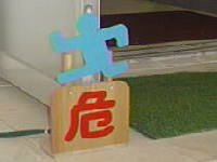 7月26日作成しました。保健室前の通路に両開きのドアがあります。。そのうちの1枚にひもがかかっていないので、突風でドーンと音がして閉まります。ガラスが割れるおそれがあるので、ドアストッパーを作成。これで児童の通行もスムーズになり、毎日開放しておくことができます。道具がないので、自宅で作りました。