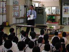 4月の全校集会では「ボランティア」のことについて、子どもたちに話をしました。昨年の花壇を作ったときに手伝ってくれた子どもたちの紹介もしました。また、私が所属している玉東町炭焼きの会の活動についても紹介しました。環境保存や自然保護の話題です。パソコンの写真をプロジェクターで投影しました。