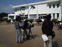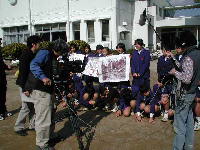 平成13年2月9日のことです。事前に連絡があった取材に、NHKの方3人がやってきました。取材の対象は6年生の学級です。内容は1年間かけて調べた「西南戦争」のことです。天気も良かったので、校庭での撮影になりました。子どもたちもテレビに出演できるということで、いつもよりうきうきしています。準備のための打ち合わせも、念入りにおこなわれました。