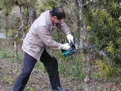 桜並木の近くには、10本ほど松が植えてあります。しかし、すでに二本が枯れています。最初の作業は、この松の木を切り倒すことです。近くに子どもたちがいないのを確認して、愛機で切断しました。あっという間に、枯れ木は倒れます。なお、この機械を使っての作業は2時間以内、という注意書きがあります。ところで今回のチェーンソーに、名前をつけなければなりません。よ〜〜〜〜く考えて、「切り太くん」にします。