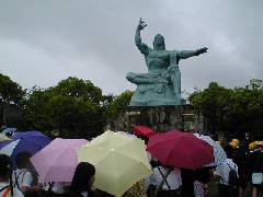今年も六年生と仲良く修学旅行に出かけました。行き先は、例年長崎方面となっています。平成13年5月30日の朝、農協の駐車場に集合して、7時40分に出発しました。途中多比良港からフェリーに乗り込み、諫早に上陸します。一日目は平和学習が主な目的ですから、平和公園・如己堂・爆心地・長崎原爆資料館を訪れます。