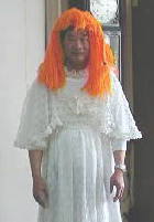 前日、校長室で衣装合わせをしたときの記念写真です。ウエディングドレスですが、サイズが小さくて困りました。背中のチャックが閉まりません。安全ピンで留めています。こんな格好をすれば校長先生の威厳もなくなりますが、年に一回くらいはいいでしょう。地域の方との信頼関係は、小さなことの積み重ねから確立するのです。