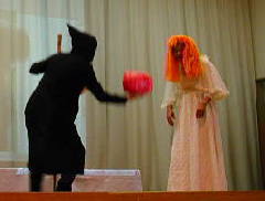 子どもたちも保護者の皆様も、とても楽しみにしている学習発表会です。平成14年3月2日(土)に、盛大に開催しました。各学年からの出し物を盛りだくさんで、練習にも熱が入っていました。子どもたちに負けてはならじと、職員一同張り切って「山北城・白雪姫物語」を公演しました。もちろん主役・白雪姫は私です。写真は魔法つかいのおばあさんから毒りんごをもらおうとしている白雪姫(福井)です。