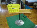 椅子の脚は10個ありましたから、次に製作したのはテニス部用の台です。ボールを入れたかごを置くために、脚を1個にしました。それは脚の部分が回転するからです。女子テニス部にプレゼントしたら、いつのまにかペットボトル用の台になっていました。(6月1日) |
