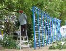 樹木剪定の二つめは、高鉄棒と遊具の上にかぶさっている枝です。剪定した木は、サクラとクスです。はしごを使い、かぶさっている枝を切り落としました。少しずつと思ったのに、済んでみると大量の枝を処分していました。この後ハサミで細かく切り、生徒と一緒に袋につめました。(8月11日) |