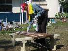 花の作業や草刈り作業と並行しておこなったのが、テーブルとベンチの工作です。これは楽しかったですね。9月19日からホワイトウッドに、防虫防腐剤を塗りました。一度塗ったあとに、もう一度塗りました。水性塗料で扱いやすく、乾けば水をはじきます。私が退職したあとも、長く使用できると思います。9月20日にベンチが二脚、9月25日にテーブルが一台、9月29日にベンチが二脚完成しました。その後も工作を続け、簡易テーブル一台、目かくしのラティス二台が完成したのです。