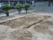 山北小学校の低学年棟の前には、大きな砂場があります。しかし木の枠がはずれ、子どもたちはここが砂場であることに気づきません。そこでスコップで掘り起こしてみました。なんと25年前のブロックの囲いが、地中から現れました。いつのまにか土砂に埋もれ、木枠も腐食したようです。2時間かけてブロックの囲いが見えるようにしました。
