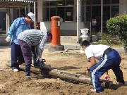 このブロックの囲いを利用して、新しい木枠を乗せることにしました。古い電柱を保存していましたので、砂場に運び、チェーンソーで切断しました。このころになると先生が二人、手伝いにやってきました。傷みがはげしい部分は切り落とし、長さをそろえました。皆で電柱をブロックに乗せ、元の囲いを形作り、砂で固定しました。電柱の厚みの半分くらいが顔を出すようにしました。
