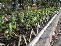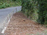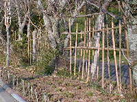 山北小学校には桜並木があります。その下に新しい花壇を作りました。花壇にはマキの木が植えてありますが、枯れている個所もあります。そこで竹垣作りをしました。近所には竹がたくさん生えているので、保護者の方に依頼して50本ほどもらいました。2mの長さで切りそろえ、写真のような竹垣が完成しました。(H12.12)