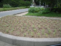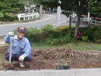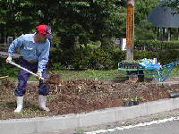山北小学校の正門近くに、年の神水源公園があります。その交差点に半円状の花壇があるのですが、何年も放置されていて雑草が茂っていました。そこで地域のためにと考え、本来の花壇の姿に戻すことにしました。まずスコップで土を掘り起こし、すべての草の根を取り除くことにしました。土も硬く、大変な作業です。