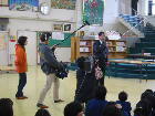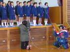 写真2 1月23日の講話集会です。この日は子どもたちを学習センターに集め、ちょんかけごま・綱渡りごま・肥後ごまの実演をしました。最後にこまの話をして終りましたが、失敗しなくてよかったです。