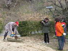 写真3 RKKの井上さんは私の作業服姿が気に入ったらしく、作業の撮影もありました。梅林に捨ててあった杉の丸太を運んで、チェーンソーで切断し、ベンチを作ってみせました。他にもホースかけや丸太の花台も作りました。