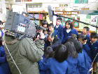 山北小学校に「週刊山崎くん」がやってきました。毎週木曜日の6:55から8:00まで、RKKテレビで放映されている番組です。二年前はNHKに出演し、ホームページの話をしました。一年前はTKUの「肥後の旬」に出演し、落花生によるピーナツ人形を作りました。そして今年、平成15年2月20日(木)にRKK出演となりました。今回の週刊山崎くんのテーマは、人形です。ここでは本校での取材風景を紹介します。