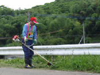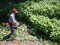 農協選果場から100mほど、梅林の坂道まで通学路が直線で続きます。ガードレールがあり、その下は白木川です。川の土手からツル性の雑草がはい上がり、道を狭くしてきます。地域の方にとっては農道ですから、車の通行も多い場所です。道幅を確保するためにも、夏場は草刈りしなければなりません。何度も金属の刃が鉄の支柱にあたり、火花が散ってキーンと音を立てます。ここでの作業は半日かかり、携帯電話と水筒持参でがんばります。