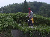 7月中旬のころです。学校のことは教頭先生ががんばっていますので、早速作業服に着替えて外にでました。ここはイモ畑の下の梅林に近い土手です。ここに生えている草は、たぶんクワクサです。一度刈ったのですが、枯れることなく再び茂ってきました。この場所は斜面のため、なかなか作業しにくく疲れます。約二時間かかってすっきりしました。