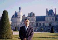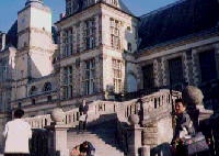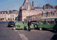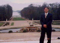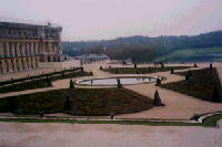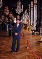 | どこまでも続くような庭園です。中央の写真は、観光客相手の乗物です。形は蒸気機関車ですが、実際は車なのです。宮殿の入り口に止まっていました。右は宮殿内部の「鏡の間」です。400枚のガラス、見事なシャンデリア、当時のフランスの栄華を見る思いです。 | ||||