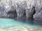 食事も済んで余裕ができたのか、遊覧船に乗ることにしました。二つのコースが設定してありましたので、私たちは「イカ丸」に乗り込みました。この船の行き先は七ツ釜であり、40分・1500円です。かなり早い船で、目的地の七ツ釜まで20分ほどで到着です。船が洞窟の中に入ると、見事にならんだ柱状節理が確認できます。