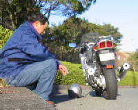高速道路で、休憩している写真です。うなだれて肩を落とし、むなしい表情をしています。頭の中は真っ白です。3時前に佐世保を出発し、西九州自動車道に入りました。この道路は、武雄JCTに接続されていて、大変便利です。ただし、最高速度は70kmに設定されていますし、料金所が二ヶ所もあり困りました。バイクは、料金支払いが面倒です。