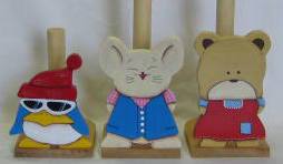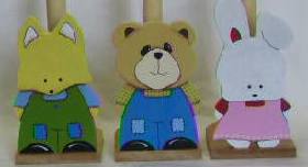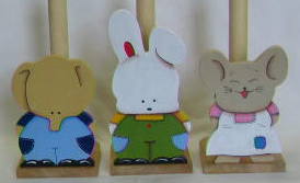 次の三つは、ゾウ・ウサギ・ネズミになります。ウサギが一番背が高くなります。緑の服には、黄色のシャツが似合うようです。