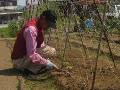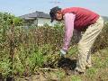 ゴーヤの畝の草取りです。ネットが邪魔。 ソラマメは完全ではありません。 枯れた茎が多く、早めに処分しました。 |