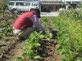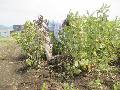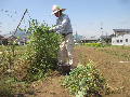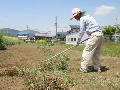 エダマメの草取りです。腰を落として、手作業になります。 最後の段階できついのは、この草取りです。膝が痛い。 |