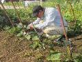 順調に生長しているナスに紐かけです。 熱く語る大西市長です。 |