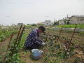 ナスの畝の草取りです。生長は順調。 |