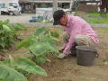 ナスの下葉と脇芽をハサミで処理しました。 次の作業はパイプを立てて、紐かけです。 ゴーヤのツルも伸びて、しっかり生長しています。 |