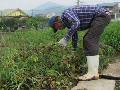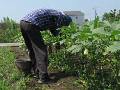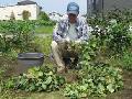 カラスが荒らすので、防草シートを 金網に固定しました。 ゴーヤが10個とれました。 エダマメの根と葉を処分しています。 |