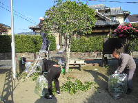 女性は室内の掃除を頑張りました。 男性は庭の手入れです。樹木の剪定をしました。 |