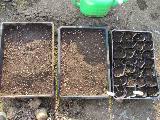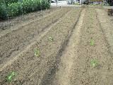 北D3にピーマンを植えました。 畝2列を使って28株です。 育苗箱にも種まきをしています。 |