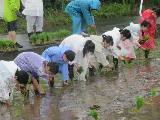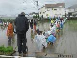 田植えの応援に駆けつけた協議会。 田植えは5年生127人が頑張りました。 |