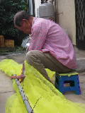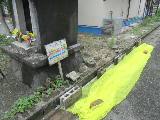 駐車場で物干し竿にネットを固定しました。 ネットも竿も4mの長さです。 地蔵堂の横にネットを設置しました。 |