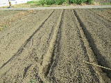 溝を掘って、レーキでならしています。 9月に肥料をまいてもう一度耕します。 |