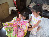 茉莉花と花蓮がお人形さんで遊んでいます。 公民館入口で資料を渡す役員たちです。 |